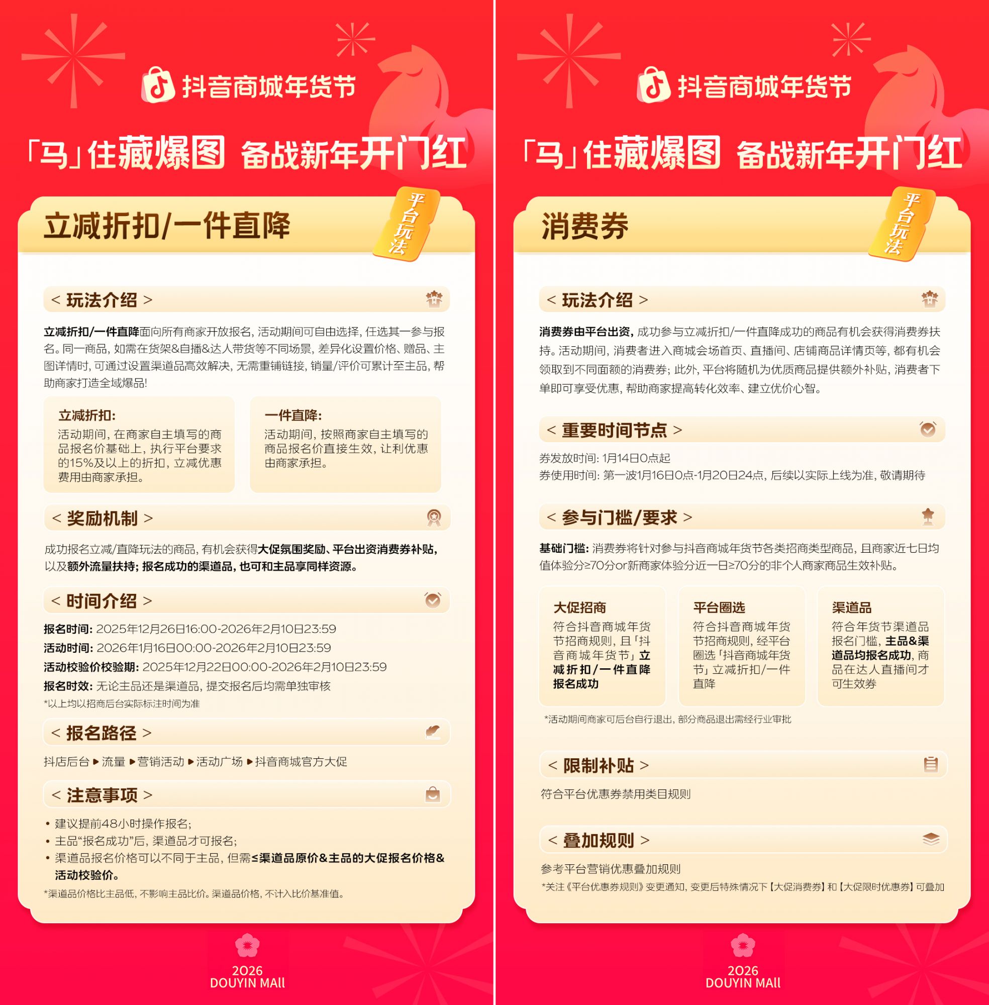 今年抖音电商推出的「一件直降 / 立减折扣」「平台消费券」等核心玩法,正是帮商家激活全域流量、打通这条转化回路的关键抓手。这些简单直接的优惠不仅降低消费者的决策门槛,也是贯穿内容场到货架场的年味氛围放大器。而参与这两大核心玩法的商家,也能快速获得全域的流量扶持,更快实现生意爆发。